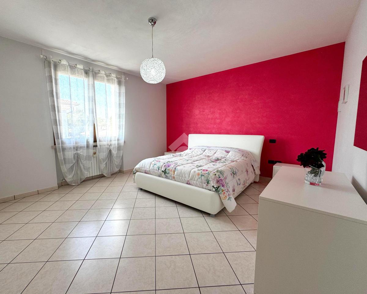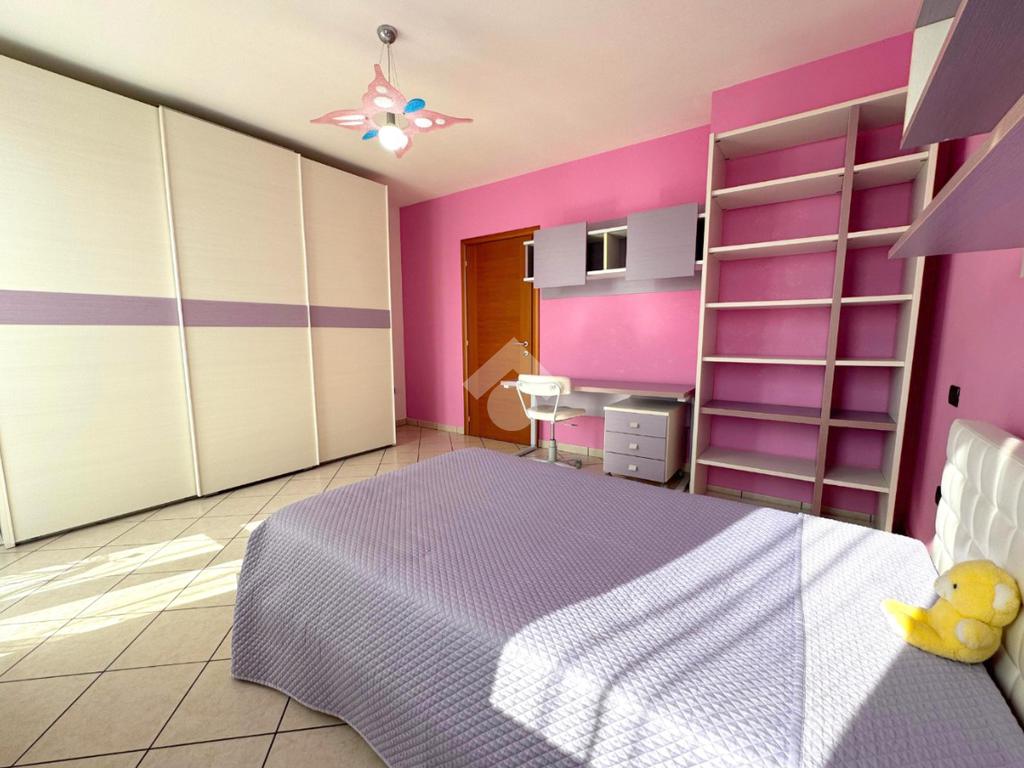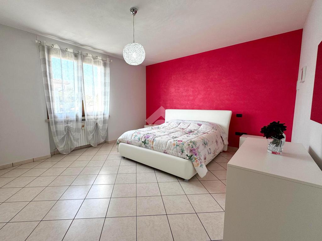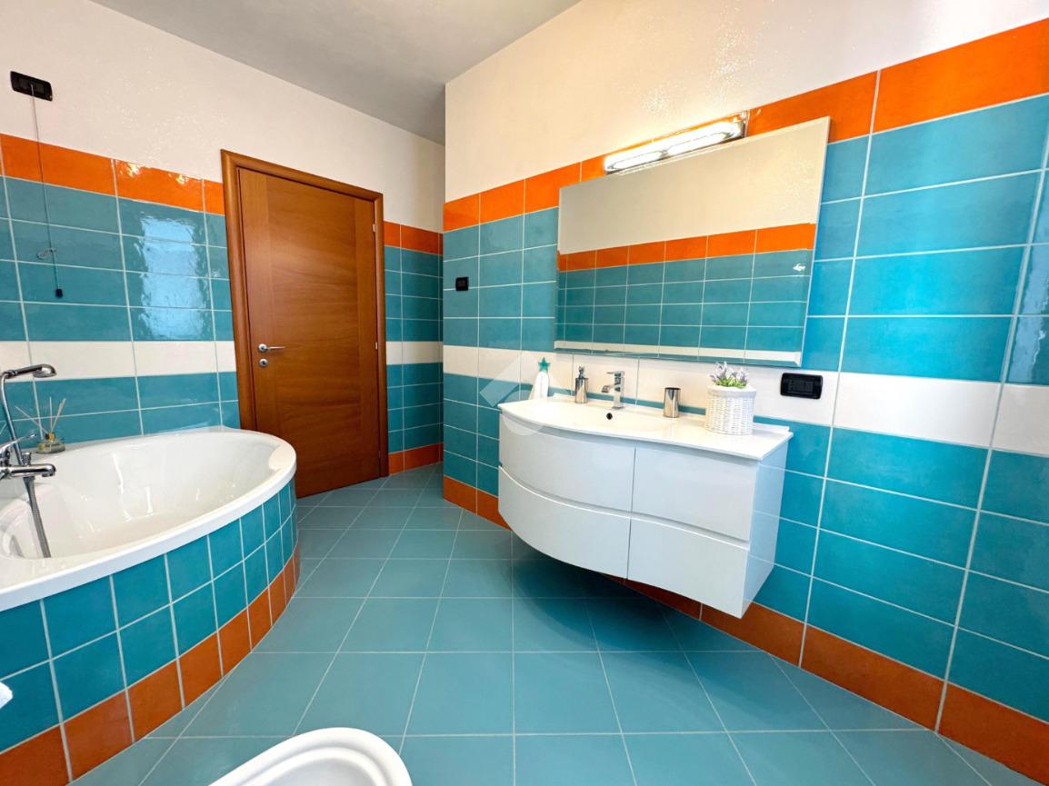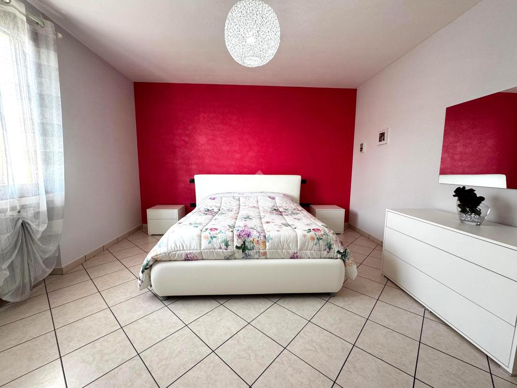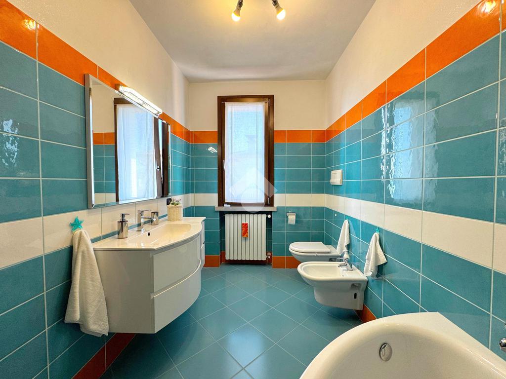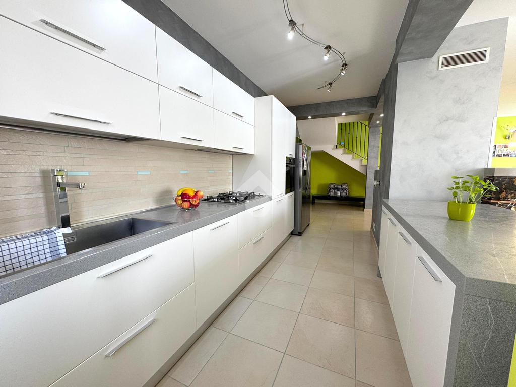 Al piano superiore si sviluppa la zona notte, composta da tre spaziose camere matrimoniali, due delle quali con accesso diretto al balcone, un bagno colorato dotato di vasca e un pratico ripostiglio.