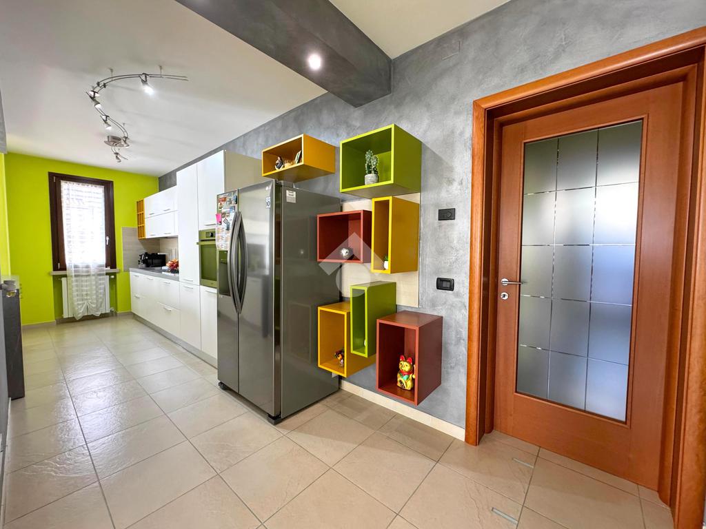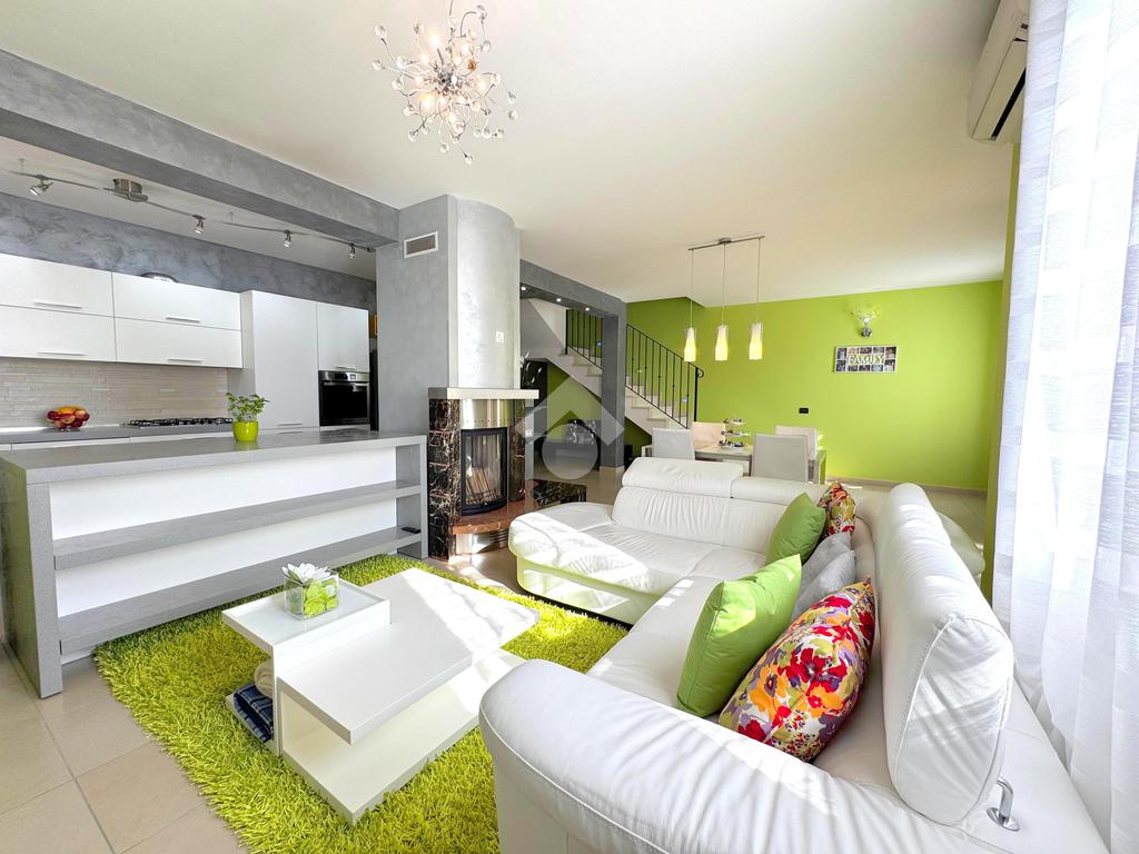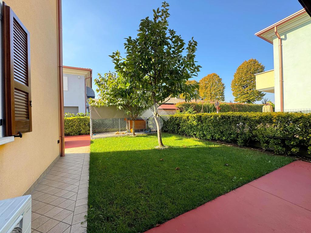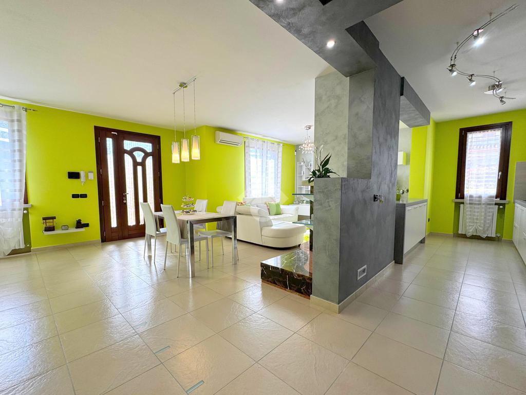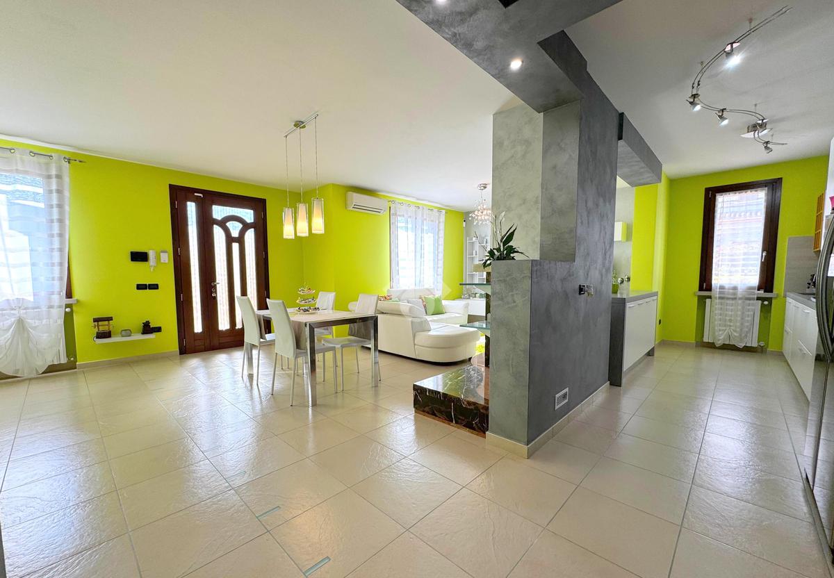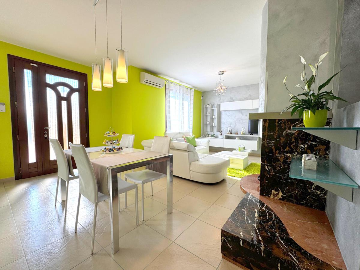 In una tranquilla zona residenziale di Rodigo, questa elegante villa bifamiliare si distingue per gli spazi generosi, le finiture curate e il comfort abitativo pensato per la famiglia.